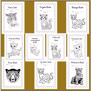 Ten English and Afrikaans subject books covered: English, Afrikaans, Mathematics, Life Skills, Handwriting, Art, Homework file, Homework book, Assessment file, Busy book.
