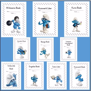 Make Classwork Fun with exciting 🍄Smurf 🍄themed book covers. Ten subject books covered: English, Afrikaans, Mathematics, Life Skills, Handwriting, Art, Homework file, Homework book, Assessment file, Busy book.
