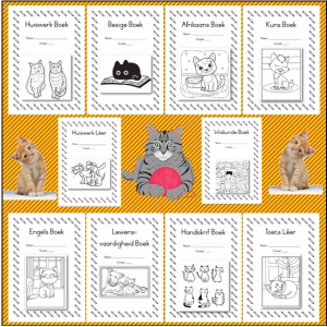 Make Classwork Fun with exciting 🐈Cat🐈themed book covers. Ten subject books covered: English, Afrikaans, Mathematics, Life Skills, Handwriting, Art, Homework file, Homework book, Assessment file, Busy book.